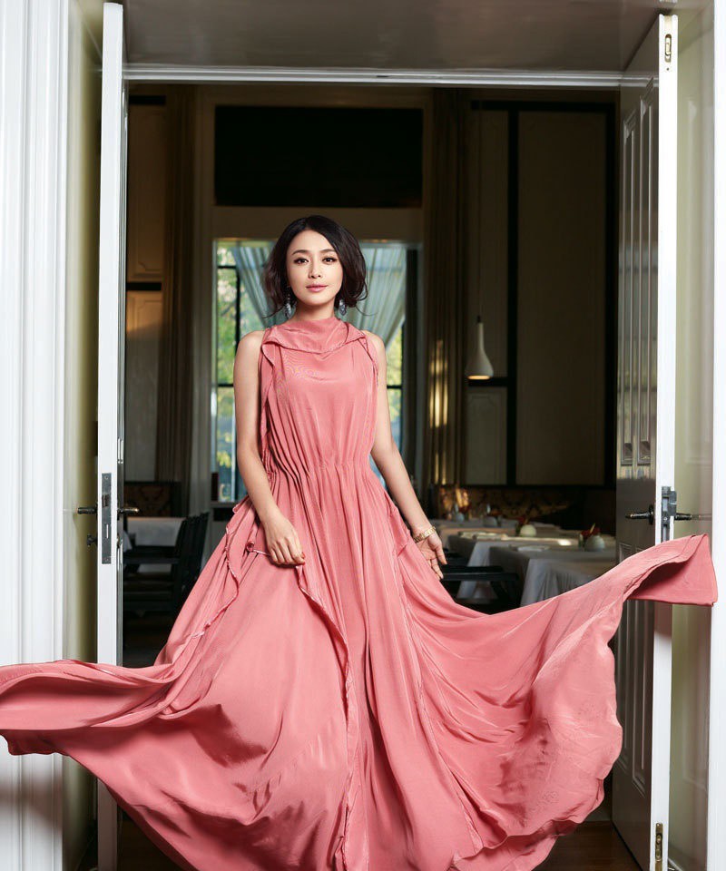 红色,在中国文化中历来象征着喜庆、热情与自信,而在时尚表达中,它更是一种极具张力的色彩语言。秦岚所演绎的红色并非炽热奔放,而是一种沉淀后的、富有故事感的酒红与正红。面料选择上,丝绸、缎面与轻盈薄纱交织,在镜头下随着她的动作流动生辉,既凸显了女性身段的柔美曲线,又凭借流畅剪裁营造出大气舒展的视觉感受。